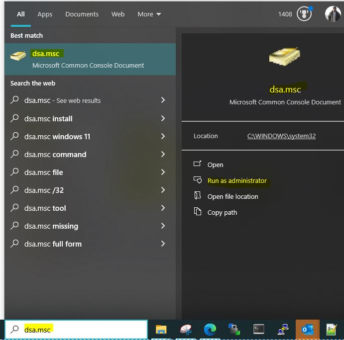 - RDP on one of the Domain Controllers and then launch ADUC by trying dsa.msc in search and then click on Run as Administrator