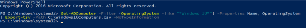 Get-ADComputer -Filter {OperatingSystem -like "Windows 10"} -Properties Name, OperatingSystem | Export-Csv -Path C:\Windows10Computers.csv -NoTypeInformation
