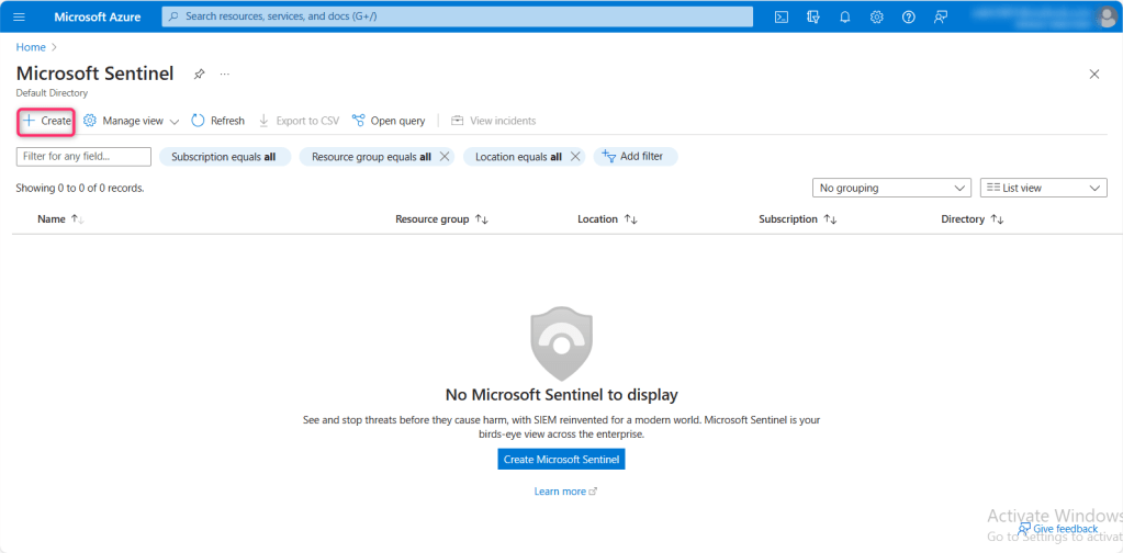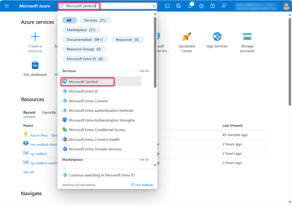 - In the Azure portal search box, type Microsoft Sentinel, then navigate down to Services section and click on Microsoft Sentinel from the list.