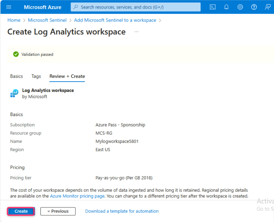 - In Create Log Analytics workspace page, after Validation passed, click on the Create button.