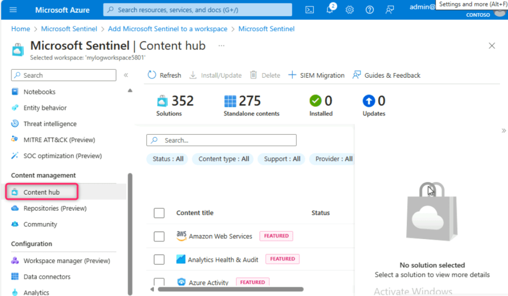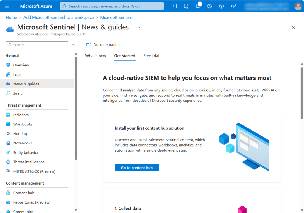 - Creating a workspace and activating Microsoft Sentinel free trial.