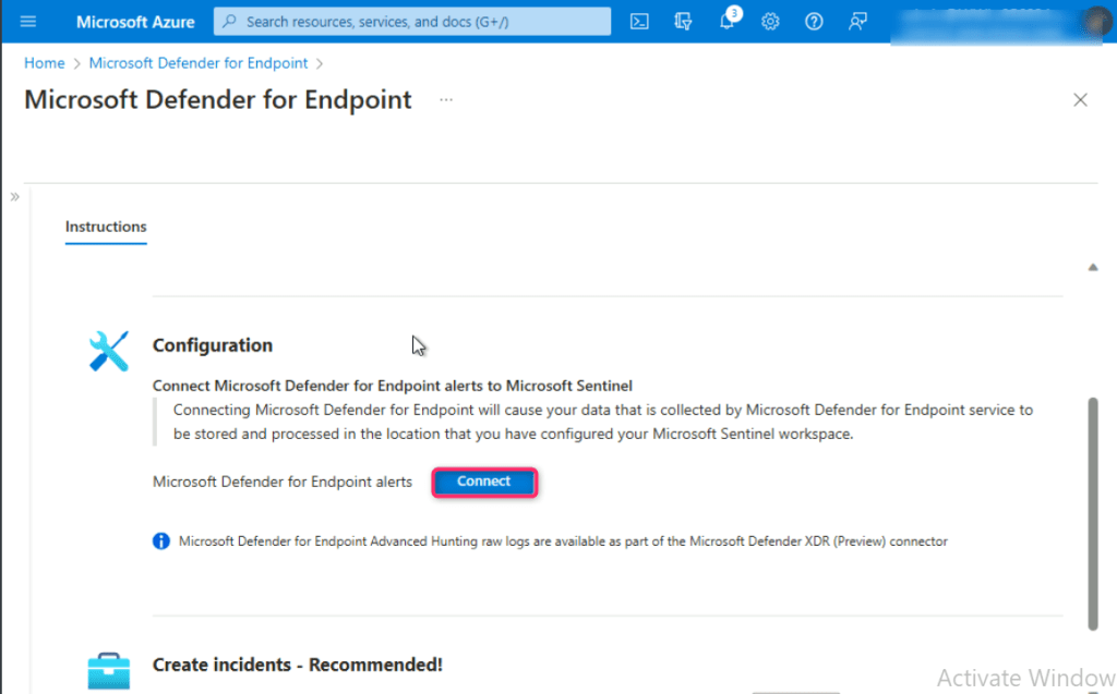 Scroll up to Configuration section, if Microsoft Defender XDR is successfully connected, then you’ll see the Disconnect button as shown in the below image. In case, if you see Connect Incidents & alerts on the button, then click on it.