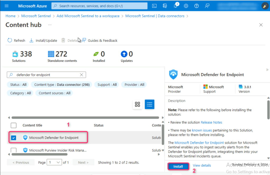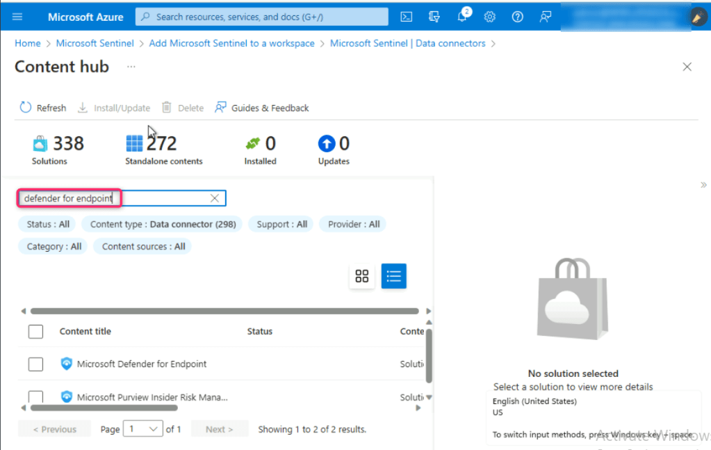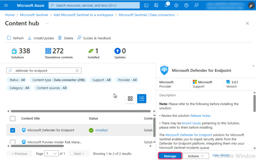 - In the content hub search bar, type defender for endpoint and press the enter button.