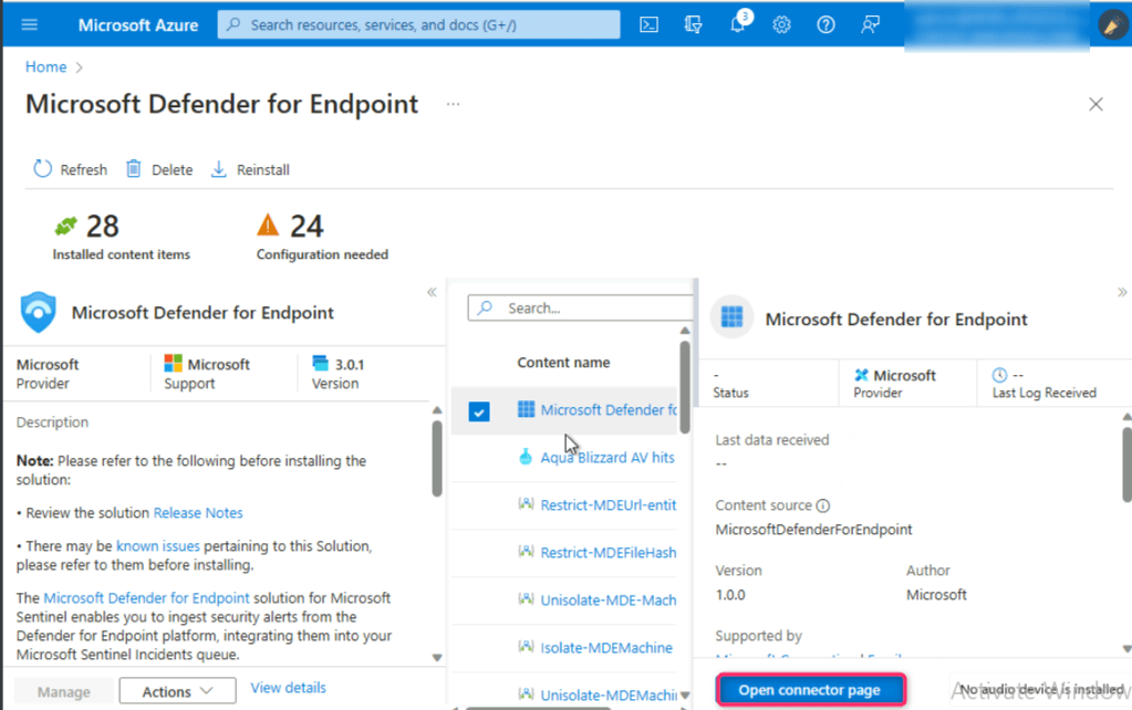 On Microsoft Defender for Endpoint page, navigate to Content name column, check the box beside Microsoft Defender for Endpoint as shown in the below image. Then, click on Open connector page button.