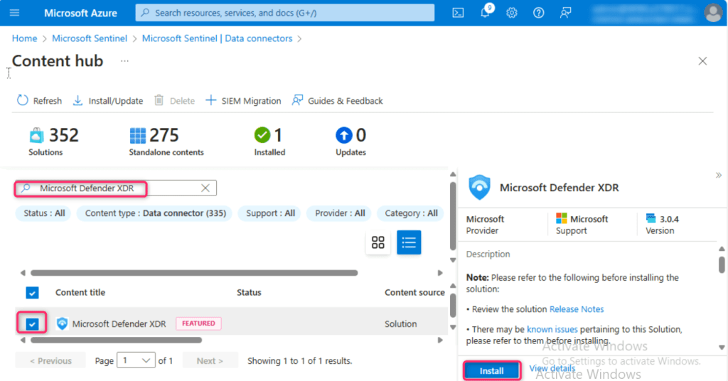 Click on Microsoft Sentinel | Content hub link below the Azure search bar as shown in the below image. In the Microsoft Sentinel | Content hub page search bar, type Microsoft Defender XDR and press the enter button. Scroll down and select Microsoft Defender XDR.