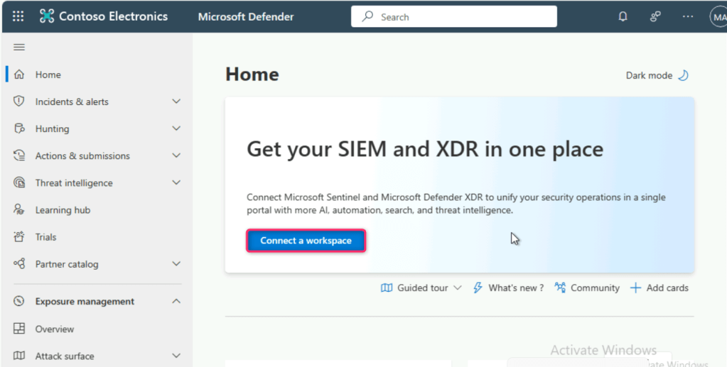 In Get your SIEM and XDR in one place dialog box, click on Connect a workspace button.