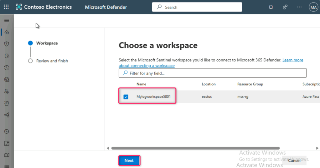 Select MylogworkspaceXXXX workspace and click on the Next button.