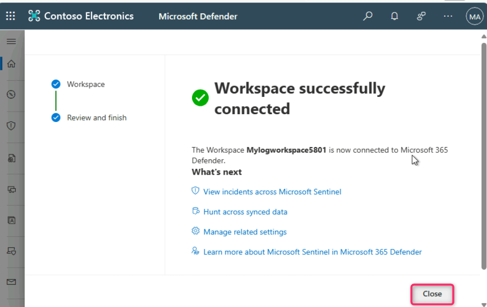 Wait for few minutes for the workspace to be successfully connected to Microsoft 365 Defender. After workspace successfully connected, click on the Close button.