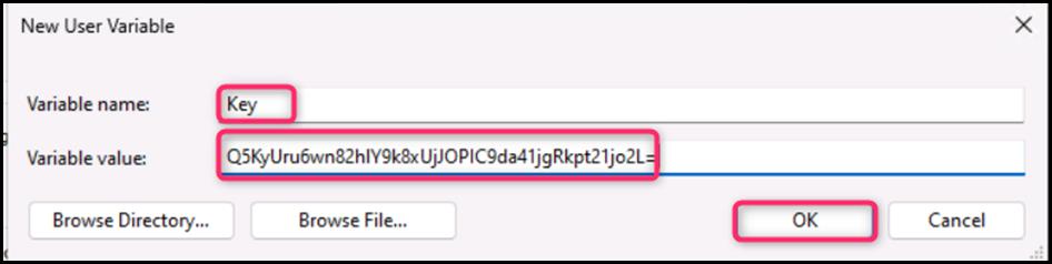 - On the New User Variable dialog box, in the Variable name field, enter Key, and in the Variable value field, enter Q5KyUru6wn82hlY9k8xUjJOPIC9da41jgRkpt21jo2L= Then, click on the OK button.
