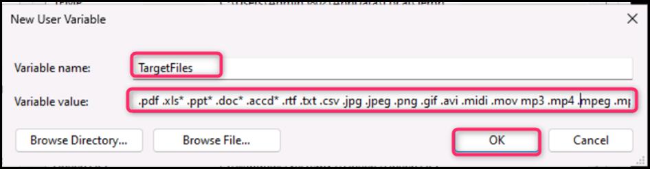 - On the New User Variable dialog box, in the Variable name field, enter TargetFiles, and in the Variable value field, enter