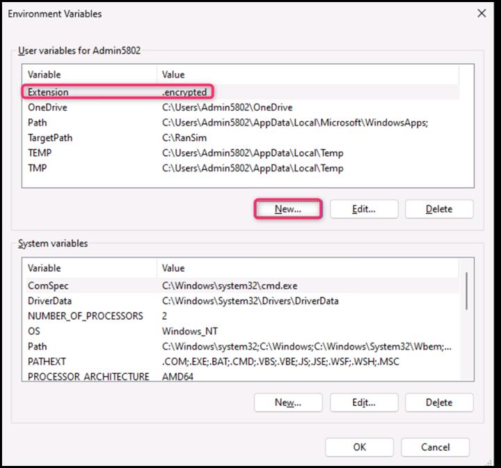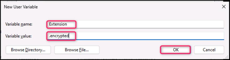 - On the New User Variable dialog box, in the Variable name field, enter Extension, and in the Variable value field, enter .encrypted. Then, click on the OK button.