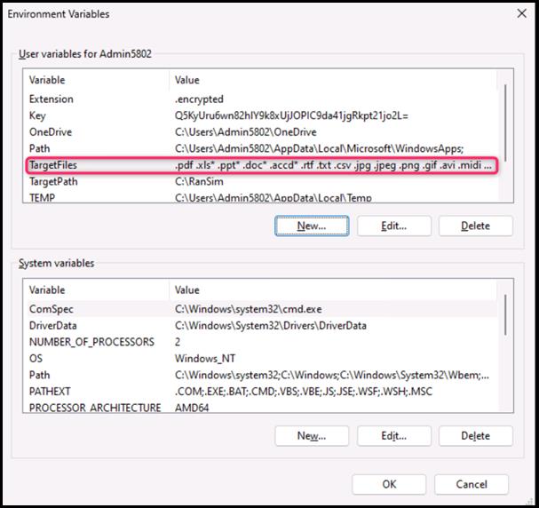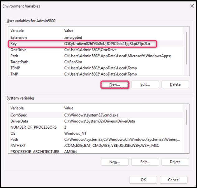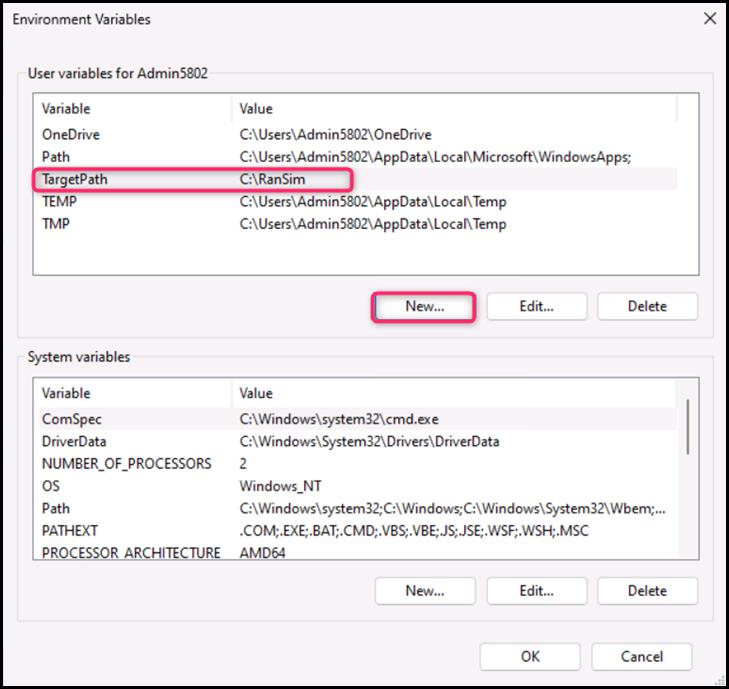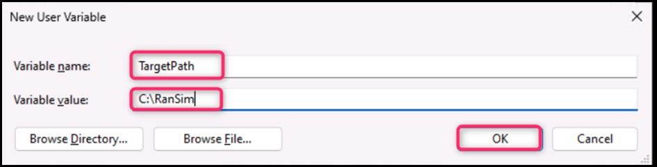 - On the New User Variable dialog box, in the Variable name field, enter TargetPath, and in the Variable value field, enter C:\RanSim, then press the OK button.