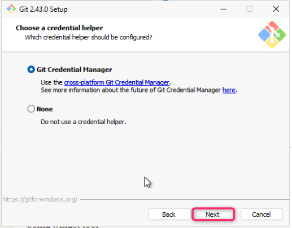 - Leave Choose a credential helper dialog box in default state and click on the Next button.