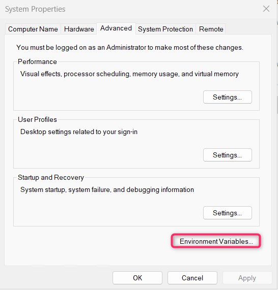 - In the System Properties dialog box, navigate and click on Environment Variables button.