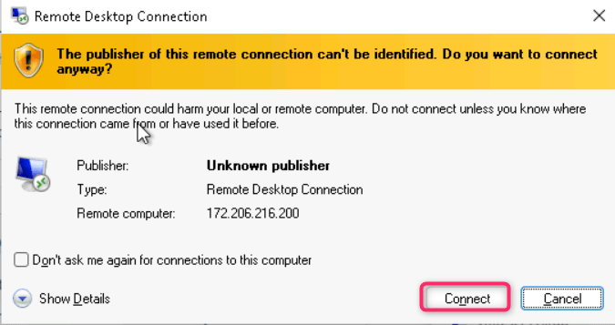 - On The publisher of this remote connection can’t be identified. Do you want to connect anyway? dialog box, click on Connect button.