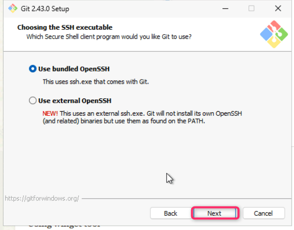 - Leave Choosing the SSH executable dialog box in default state and click on the Next button.