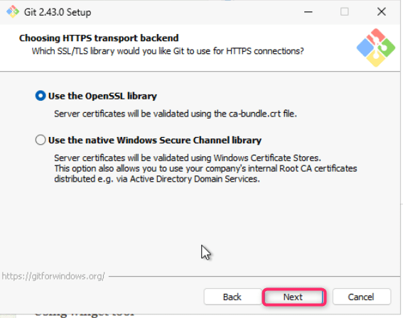 - Leave Choosing HTTPS transport backend dialog box in default state and click on the Next button.
