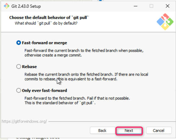 - Leave Choose the default behavior of ‘git pull’ dialog box in default state and click on the Next button.