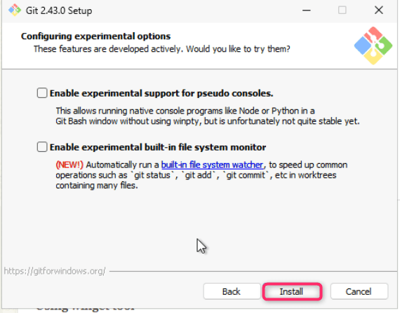 - Leave Configuring experimental options dialog box in default state and click on the Install button.