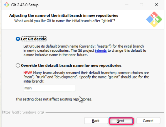 - Leave Adjusting the name of the initial branch in new repositories dialog box in default state and click on the Next button.