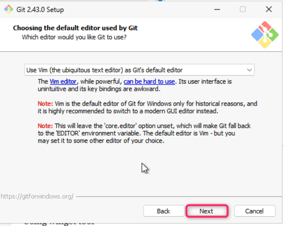 - On Choosing the default editor used by Git dialog box, click on the Next button.