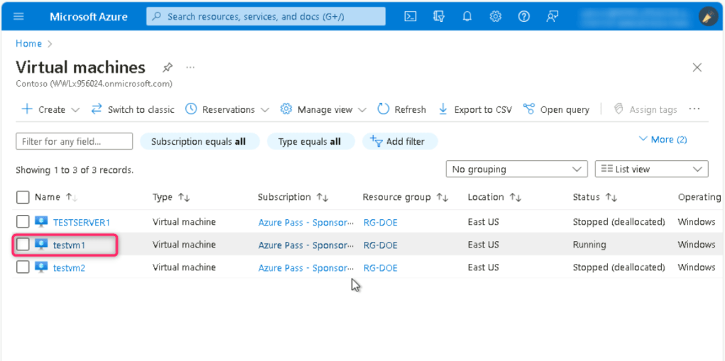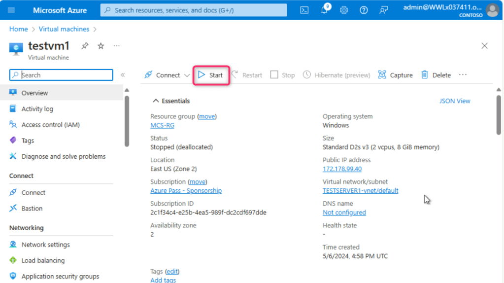 - In the Virtual machines page, navigate and click on testvm1. On testvm1 Virtual machine page, click on the Start button.