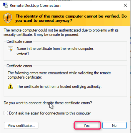 - On The identity of the remote computer cannot be verified. Do you want to connect anyway? dialog box, click on Yes button.