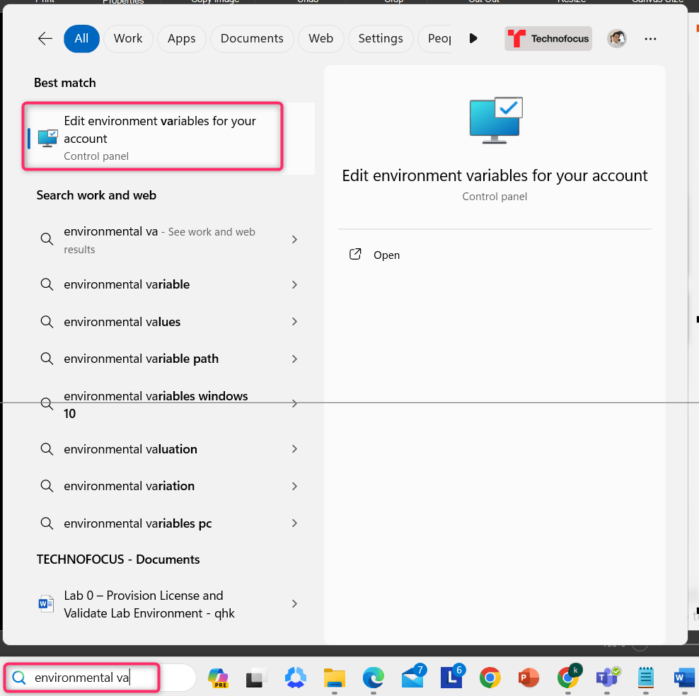 - In testvm1 search bar, type environment variables, then navigate and click on Edit environment variables for your account as shown in the below image.