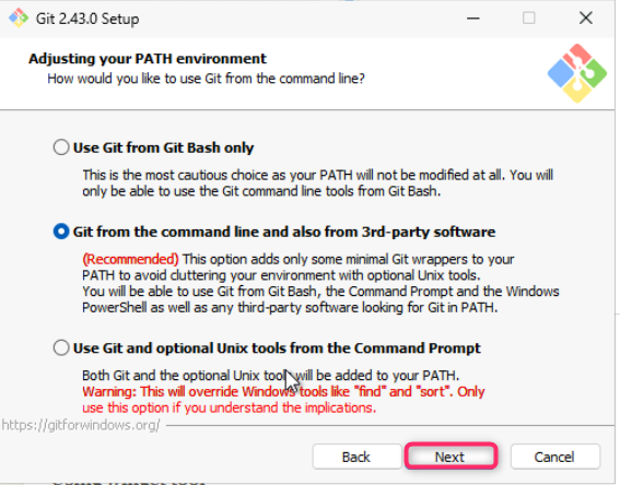 - Leave Adjusting your PATH environment dialog box in default state and click on the Next button.