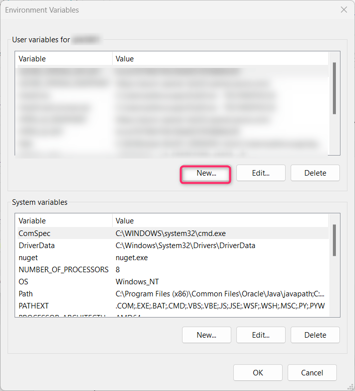 - In the Environment Variables dialog box, click on the New button.