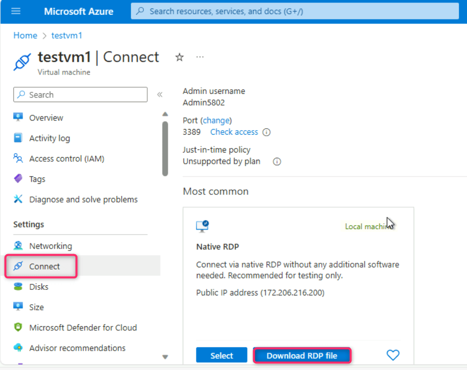 - Wait for few minutes for the virtual machine to start, then navigate and click on Connect on the left side navigation menu, scroll down to Native RDP tile, and click on the Download RDP file.