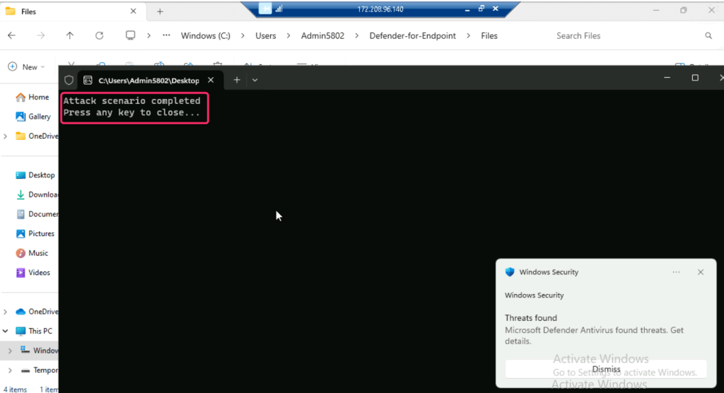 Note: The script may be successfully executed or it might be blocked by Microsoft Antivirus. In both the scenarios, continue with the next task, as our goal is to record the alerts generated during the attack.