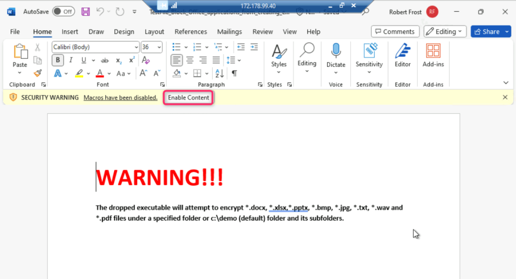 - Click on Enable content, it will execute another ransomware attack in testvm1.