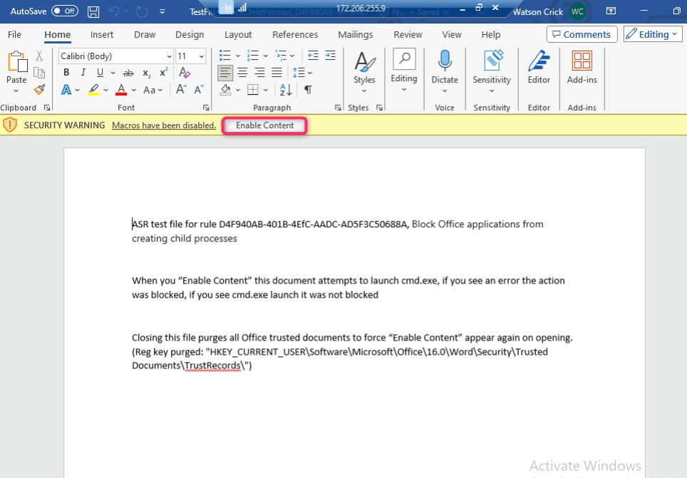 - Click on Enable Content. If you see an error, the action was blocked. If you see cmd.exe launch, it was not blocked.