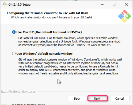 - Leave Configuring the terminal emulator to use with Git Bash dialog box in default state and click on the Next button.