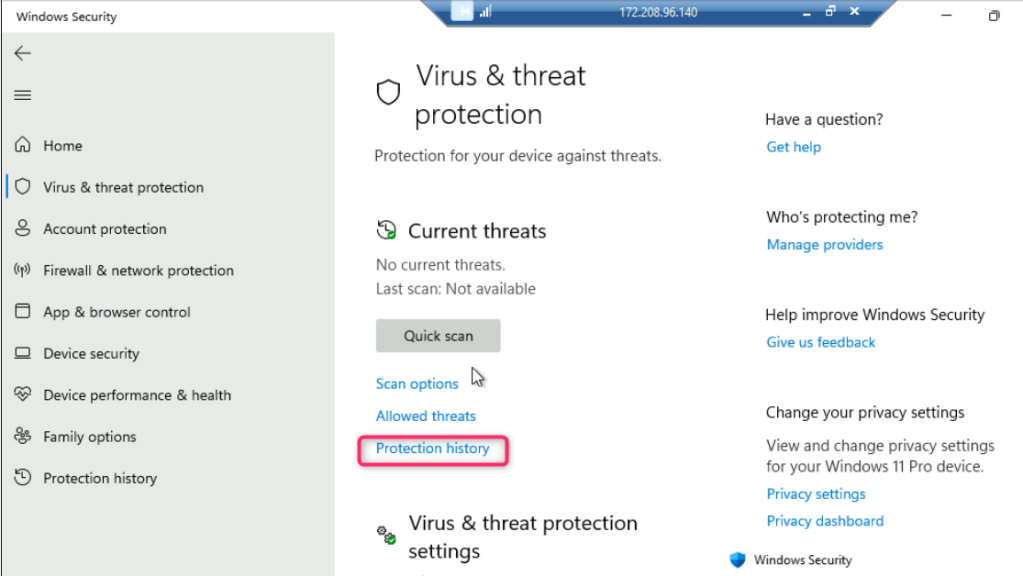 - In Virus & threat protection page, under Current threats section, navigate and click on Protection history.