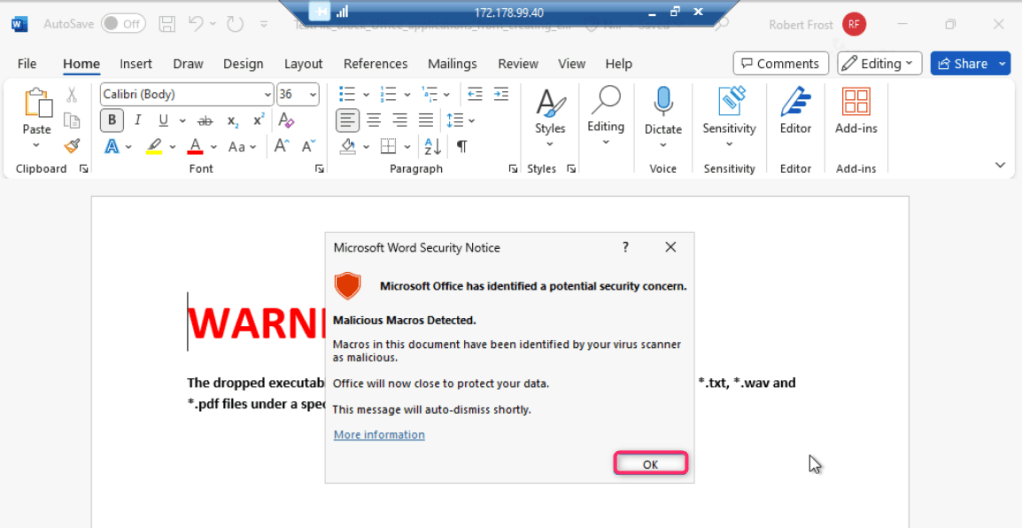 In case, Microsoft Word Security Notice dialog box appears, click on the OK button.
