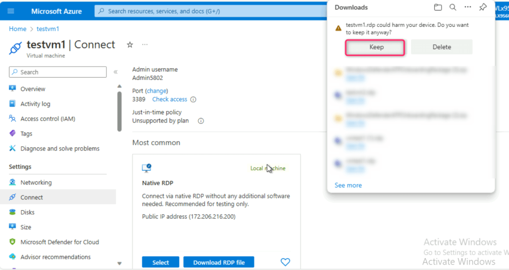 - On testvm1.rdp could harm your device. Do you want to keep it anyway? dialog box, click on Keep button.