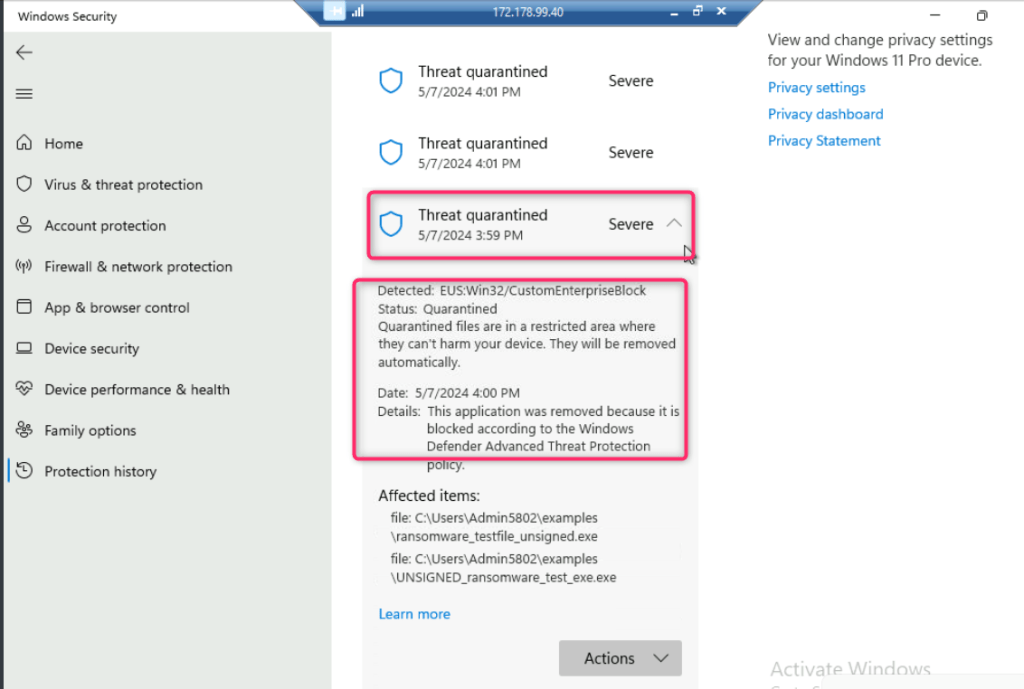 - Click on Threat quarantined to view the details.
