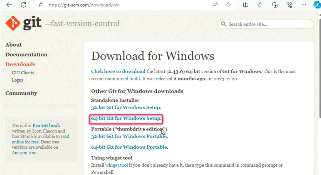 - On Download for Windows page, navigate to Standalone Installer and click on 64-bit Git for Windows Setup.