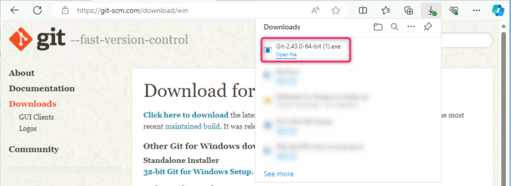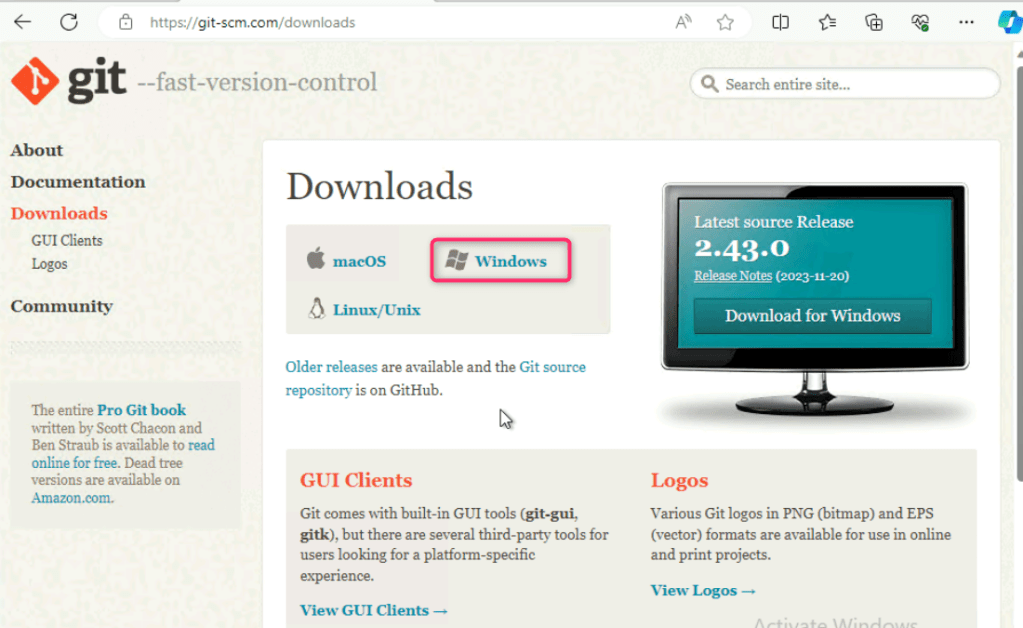 - On git window, navigate to Downloads section and click on Windows as shown in the below image.