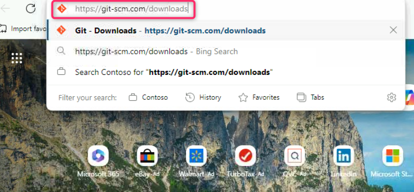 - Open the Edge browser, navigate to the address bar and enter the following link: https://git-scm.com/downloads