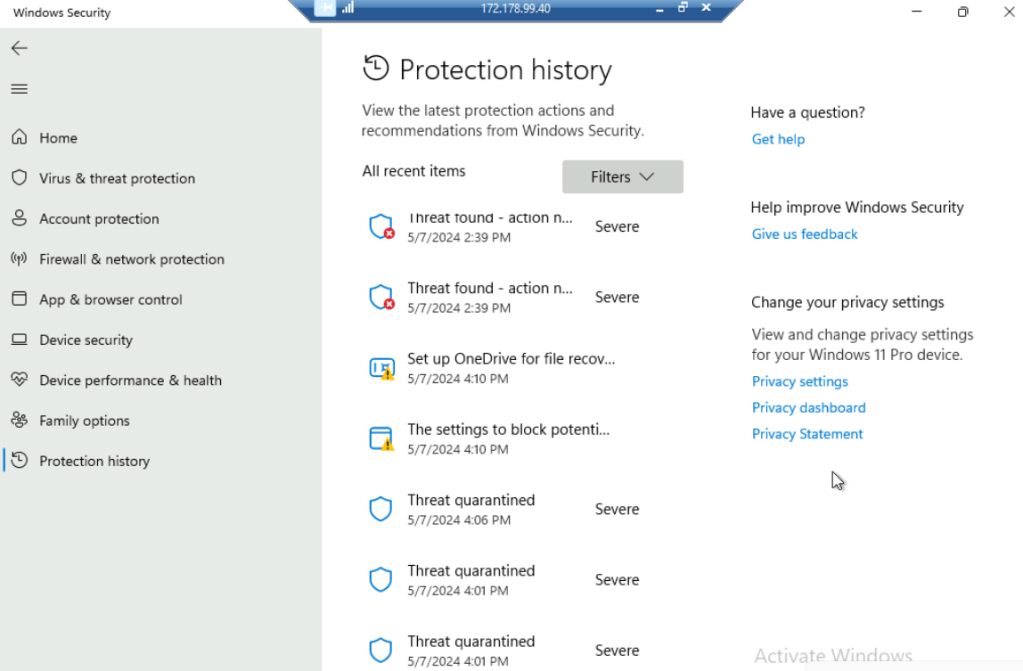 Task 4: Checking protection action and recommendations from Windows Security
