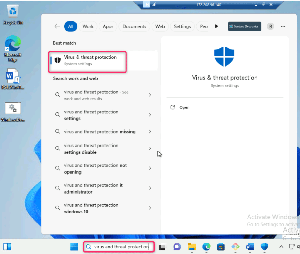 - In testvm1 search bar, type virus and threat protection, then navigate and click on Virus & threat protection under Best match as shown in the below image.